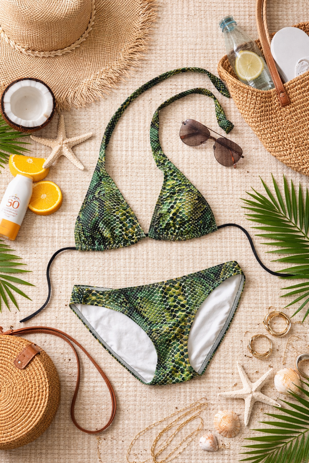 100% Australian made Women’s swimwear – Green Snakeskin Halter Top with Green snakeskin Bottom. Sexy and Sassy, inspired by body beautiful Miami.